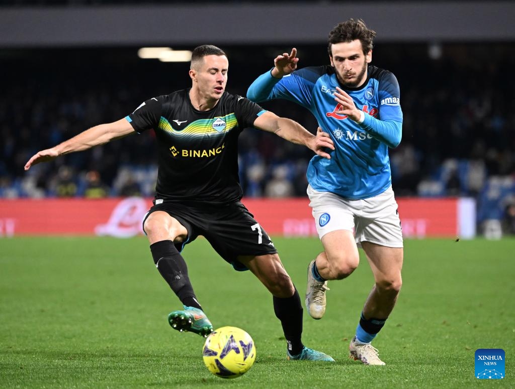Napoli's Khvicha Kvaratskhelia (R) vies with Lazio's Adam Marusic during a Serie A football match between Napoli and Lazio in Naples, Italy, March 3, 2023. (Photo by Alberto Lingria/Xinhua)