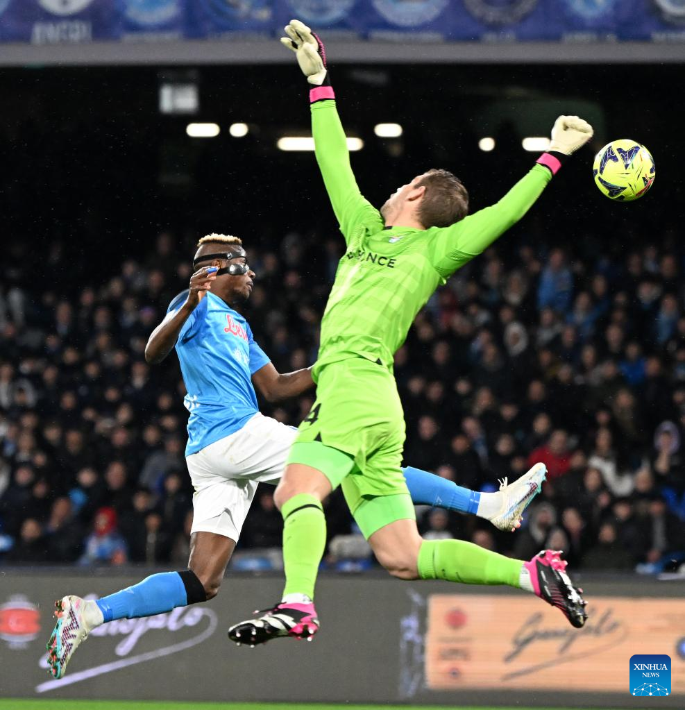 Napoli's Victor Osimhen (L) vies with Lazio's goalkeeper Ivan Provedel during a Serie A football match between Napoli and Lazio in Naples, Italy, March 3, 2023. (Photo by Alberto Lingria/Xinhua)