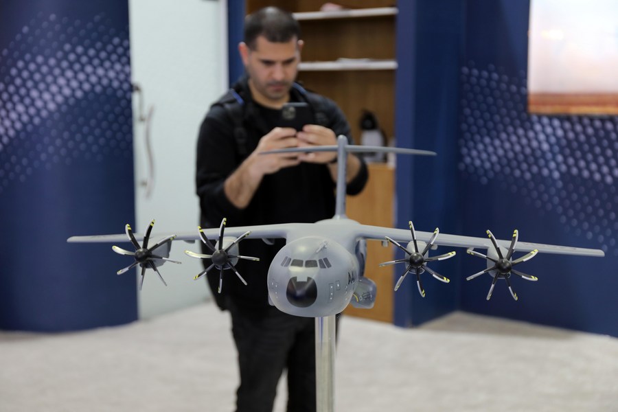 A visitor takes a picture with his mobile of an aircraft displayed at the International Security and Defense Exhibition in Baghdad, Iraq, on March 4, 2023. (Xinhua/Khalil Dawood)