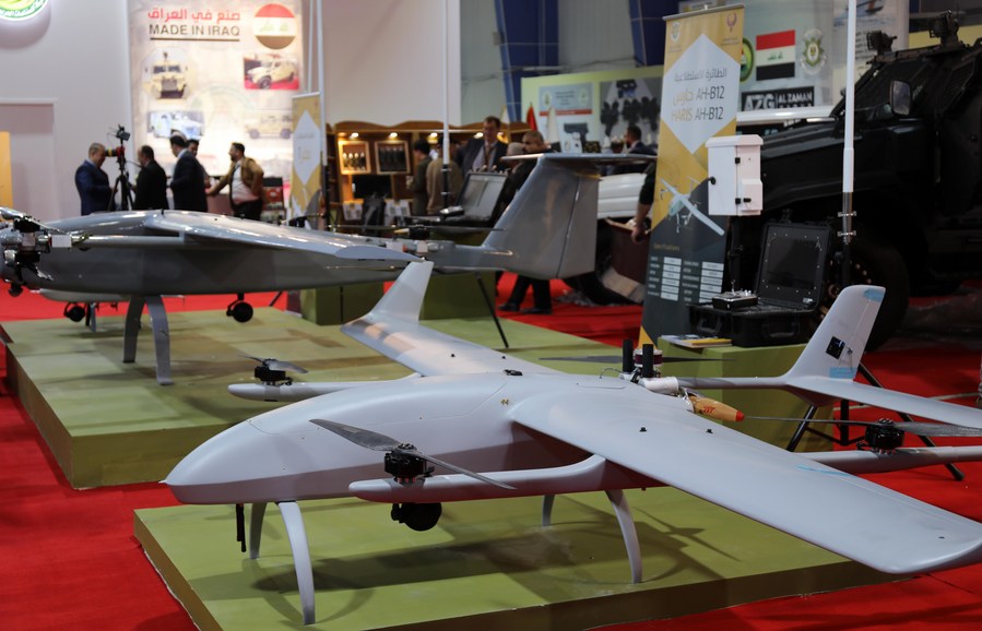 An Iraqi company displays its plane models during the International Security and Defense Exhibition in Baghdad, Iraq, on March 4, 2023. (Xinhua/Khalil Dawood)