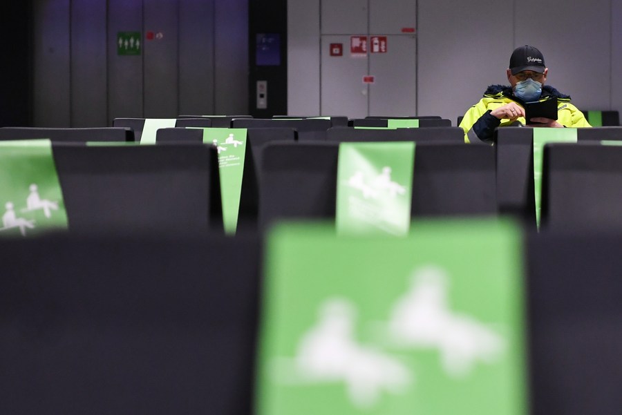 A man wearing a face mask sits on a seat at an international airport in Frankfurt, Germany, on March 18, 2021. (Xinhua/Lu Yang)
