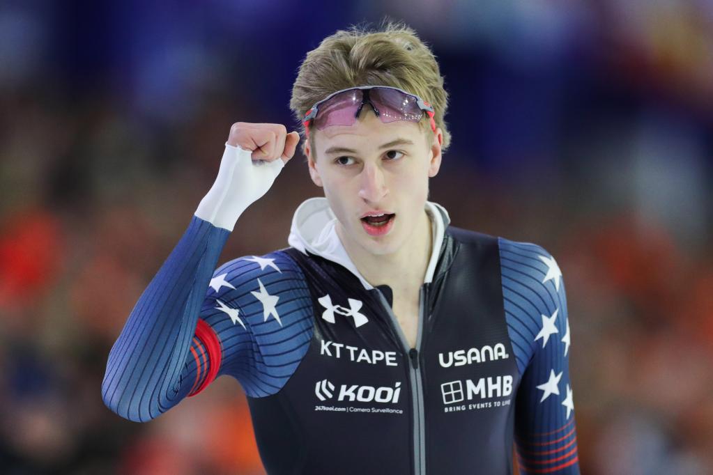 Jordan Stolz of the United States celebrates after the men's 1,000m final at the ISU World Speed Skating Championships in Heerenveen, the Netherlands, March 4, 2023. (Xinhua/Zheng Huansong)