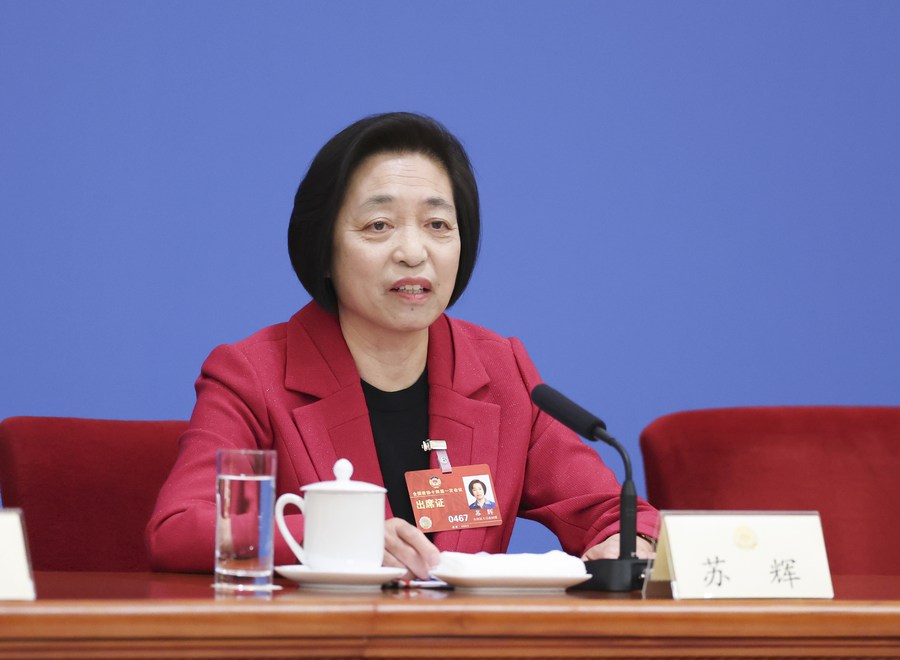Su Hui, chairperson of the Central Committee of the Taiwan Democratic Self-Government League, speaks at a press conference during the first session of the 14th National Committee of the Chinese People's Political Consultative Conference (CPPCC) at the Great Hall of the People in Beijing, capital of China, March 5, 2023. (Xinhua/Cao Can)