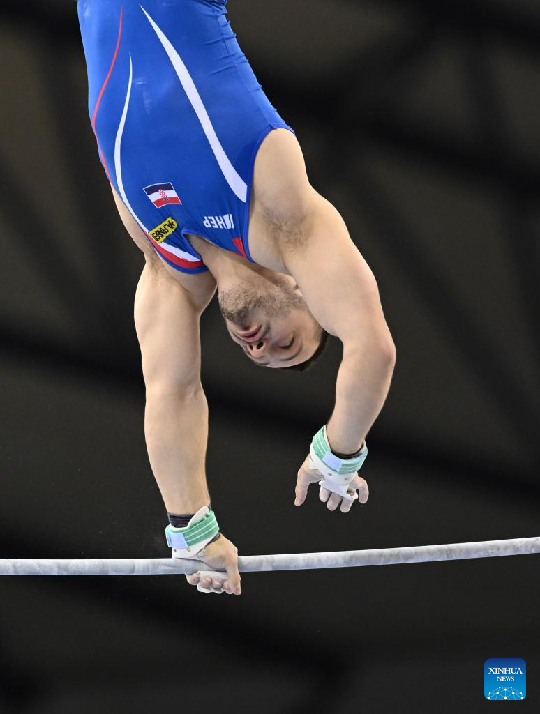 Ahmed Elmaraghy of Egypt competes during the horizontal bar final at the 15th FIG Artistic Gymnastics World Cup in Doha, Qatar, March 4, 2023. (Photo by Nikku/Xinhua)