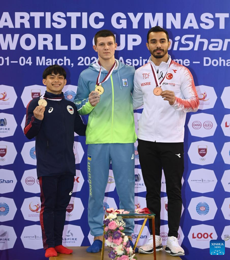 Gold medalist Illia Kovtun (C) of Ukraine, silver medalist Carlos Edriel Yulo (L) of the Philippines and bronze medalist Ferhat Arican of Türkiye pose for group pictures during the awarding ceremony after the parallel bars final at the 15th FIG Artistic Gymnastics World Cup in Doha, Qatar, March 4, 2023. (Photo by Nikku/Xinhua)