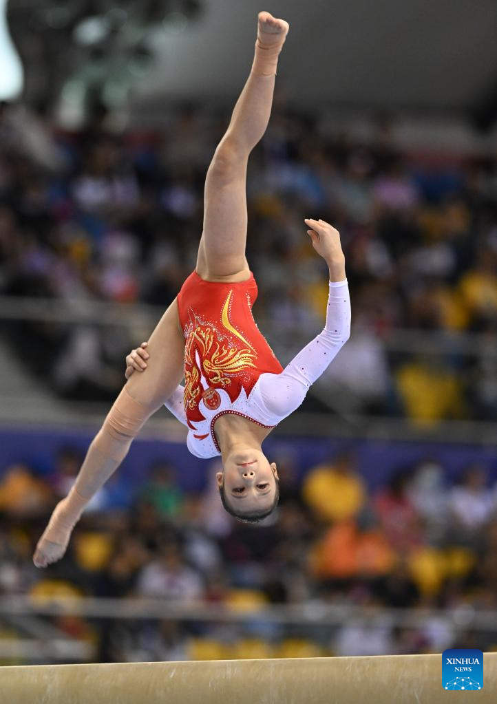 Qiu Qiyuan of China competes during the women's balance beam final at the 15th FIG Artistic Gymnastics World Cup in Doha, Qatar, March 4, 2023. (Photo by Nikku/Xinhua)