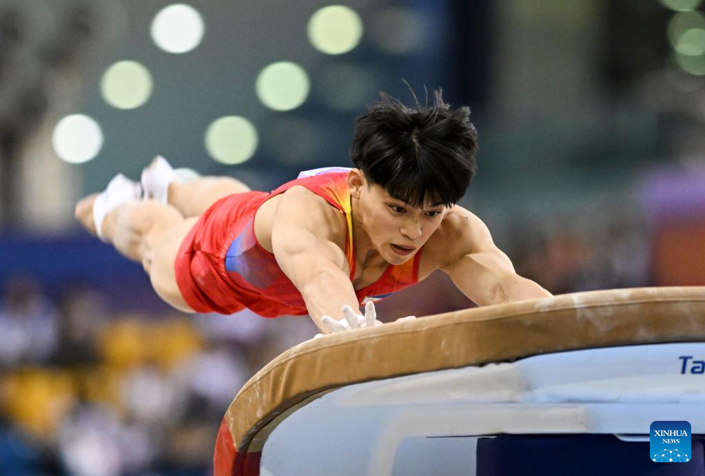 Carlos Edriel Yulo of the Philippines competes during the men's vault final at the 15th FIG Artistic Gymnastics World Cup in Doha, Qatar, March 4, 2023. (Photo by Nikku/Xinhua)