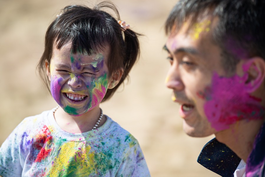 A girl plays with colored powders in Holi Festival in Macao, south China, on March 5, 2023. (Xinhua/Cheong Kam Ka)