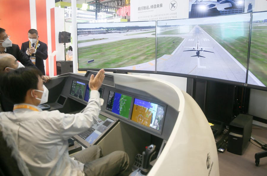 A staff member instructs as a visitor tries a flight simulator at the Honeywell booth at the Intelligent Industry & Information Technology Exhibition Area of the fifth China International Import Expo (CIIE) at the National Exhibition and Convention Center (Shanghai) in east China's Shanghai, Nov. 5, 2022. (Xinhua/Zhang Keren)