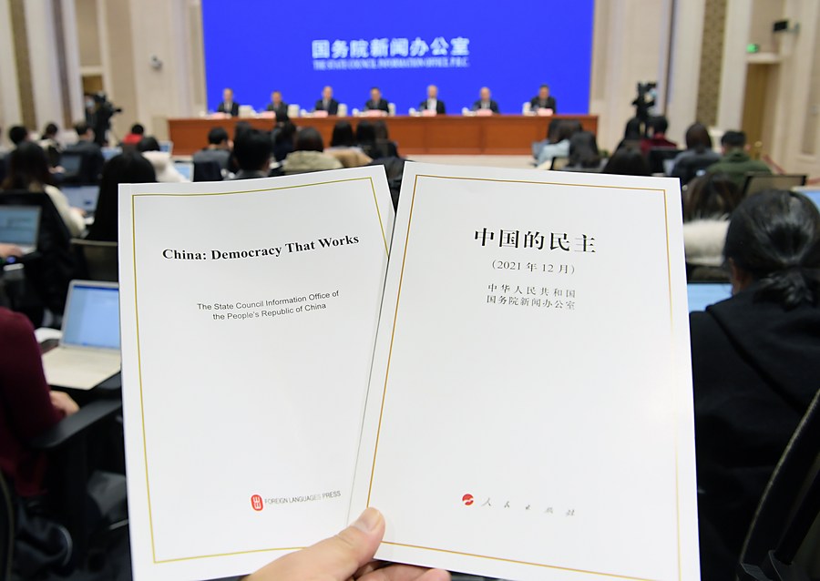 Photo shows the Chinese and English editions of the white paper titled "China: Democracy That Works" at a press conference held by the State Council Information Office in Beijing, capital of China, Dec. 4, 2021. (Xinhua/Li He)