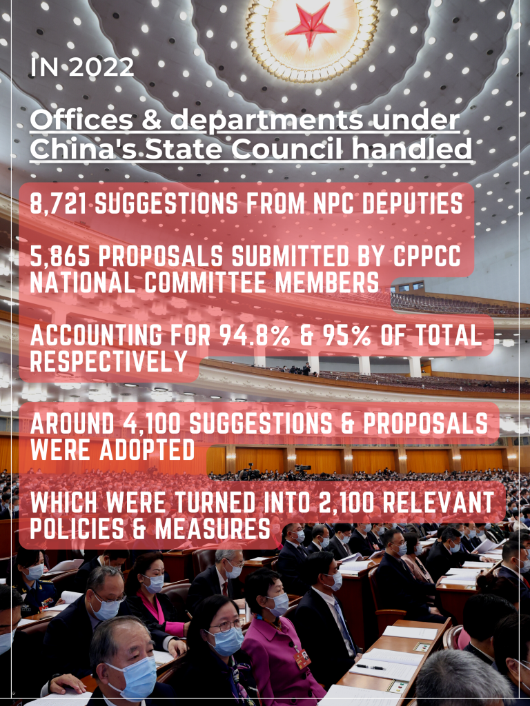 Official data showed that in 2022, offices and departments under China's State Council handled 8,721 suggestions from NPC deputies and 5,865 proposals submitted by CPPCC National Committee members, accounting for 94.8 percent and 95 percent of the total respectively. Around 4,100 suggestions and proposals were adopted, which were turned into 2,100 relevant policies and measures.
