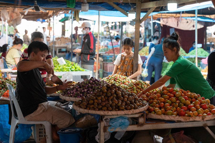 VIENTIANE, March 8 (Xinhua) -- Lao Aussie Fresh Market, located at Nong Teng village of Naxaythong district in Lao capital Vientiane, is the largest wholesale market in the Southeast Asian country. The market provides products like fresh vegetables, meat, and fish, etc., at a lower price, which attracts local residents to buy directly from the wholesalers.