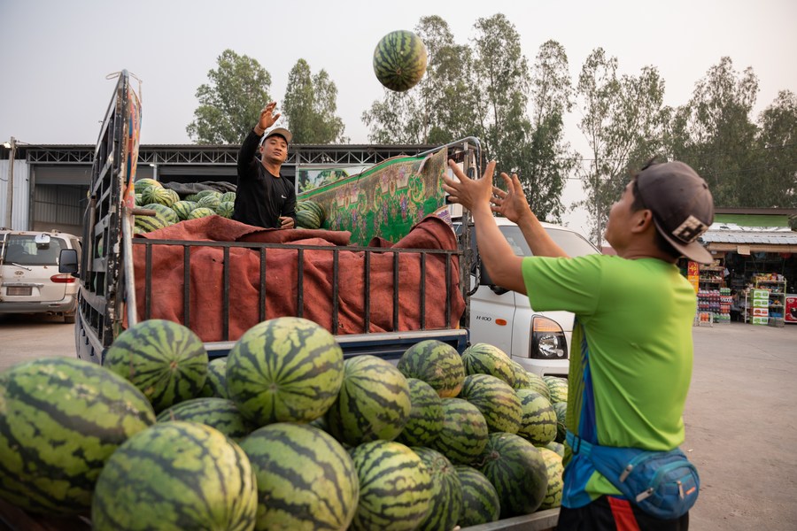 Stallkeepers unload watermelons in Lao Aussie Fresh Market in Lao capital Vientiane, March 5, 2023. (Photo by Kaikeo Saiyasane/Xinhua) ■