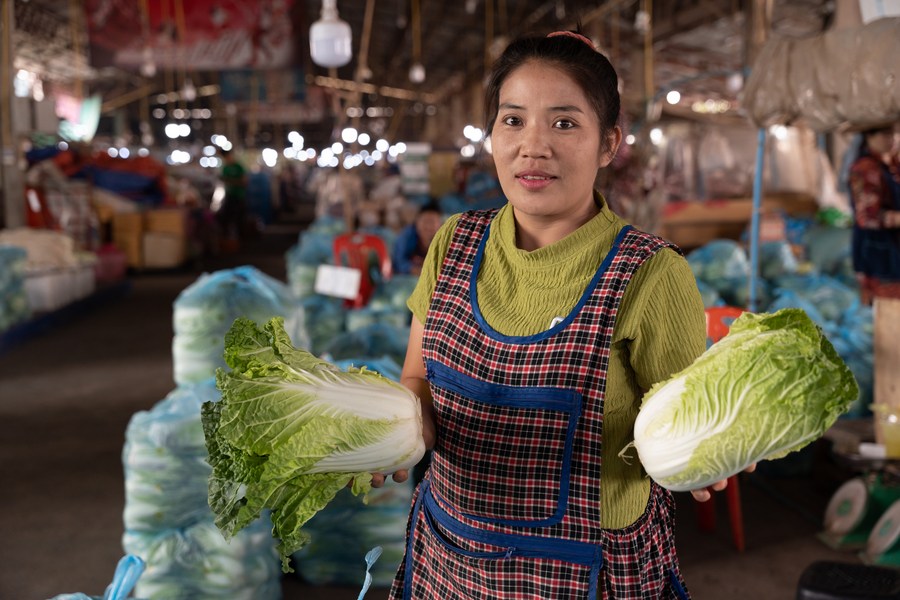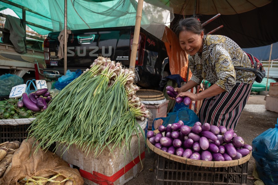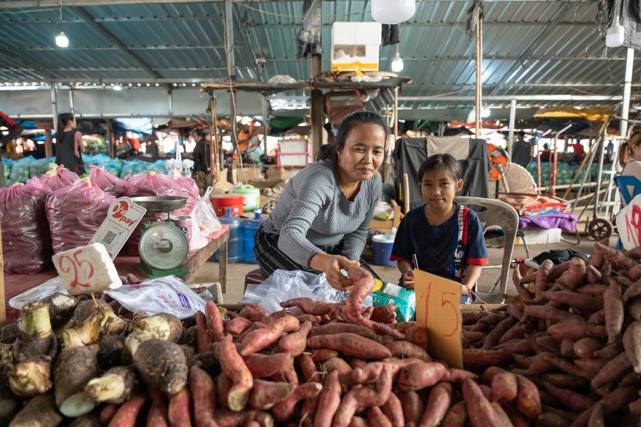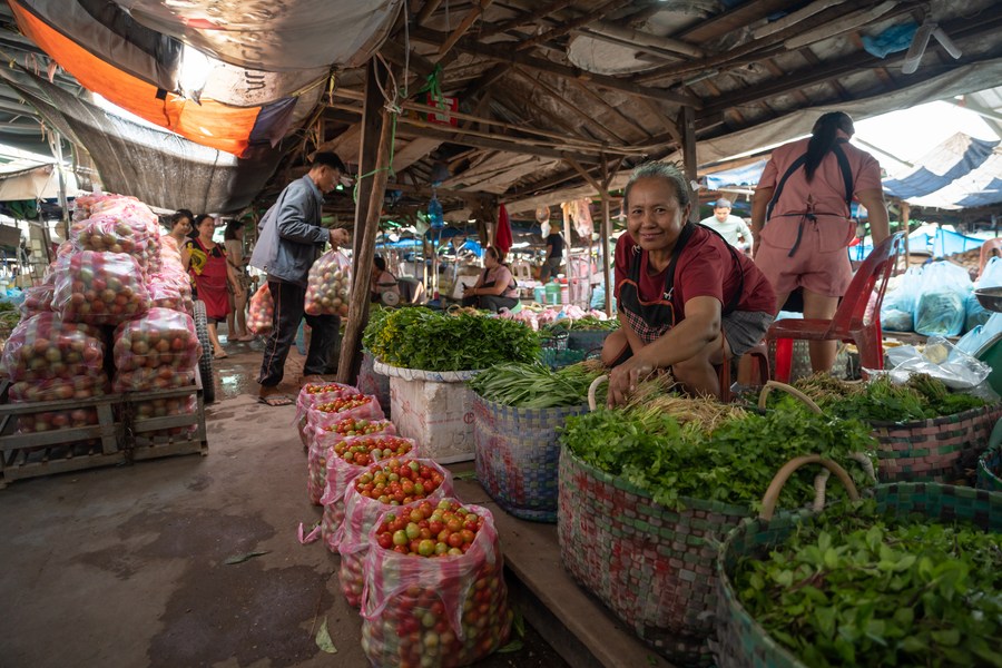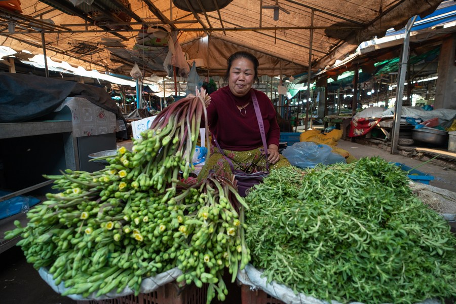 A stallkeeper in Lao Aussie Fresh Market in Lao capital Vientiane, March 5, 2023. (Photo by Kaikeo Saiyasane/Xinhua)
