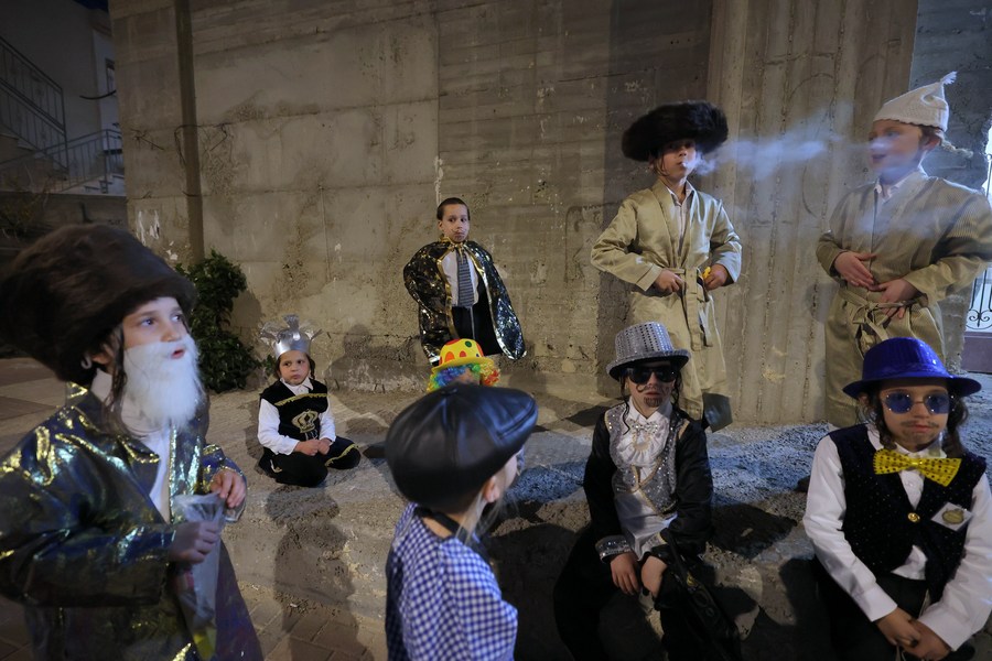 Ultra-Orthodox Jewish boys wearing costumes celebrate the Jewish holiday of Purim in Ashdod, Israel, on March 6, 2023. (Ilan Assayag/JINI via Xinhua)