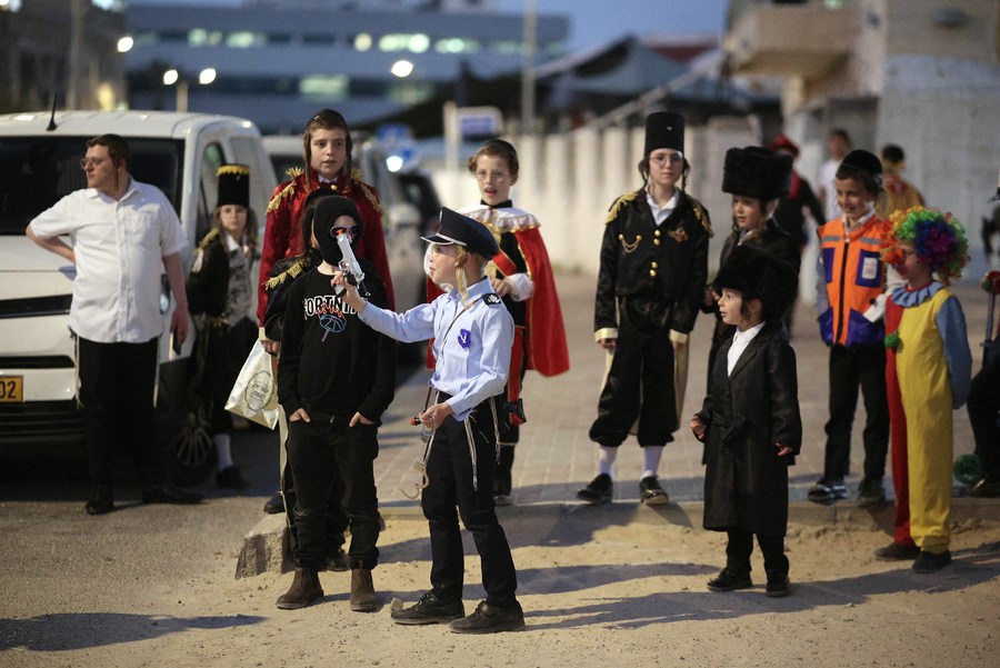 Ultra-Orthodox Jewish boys wearing costumes celebrate the Jewish holiday of Purim in Ashdod, Israel, on March 6, 2023. (Ilan Assayag/JINI via Xinhua) ■