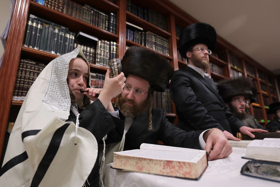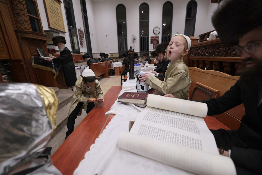 Ultra-Orthodox Jews read the Biblical Book of Esther which tells the story of the Jewish holiday of Purim at a synagogue in Ashdod, Israel, on March 6, 2023. (Ilan Assayag/JINI via Xinhua)