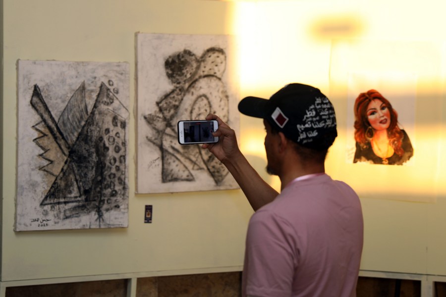 A visitor takes photos of paintings at an art gallery opened to mark the International Women's Day in Aswan, Egypt, on March 8, 2023. (Xinhua/Ahmed Gomaa)