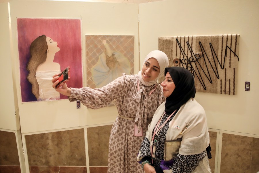 Visitors take selfie with artworks at an art gallery opened to mark the International Women's Day in Aswan, Egypt, on March 8, 2023. (Xinhua/Ahmed Gomaa)