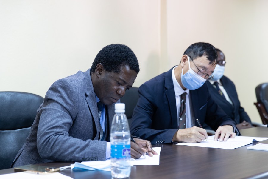 Charles Mutemba (L), senior medical superintendent at the University Teaching Hospital (UTH), and Liu Guoyu, economic and commercial counselor at the Chinese Embassy in Zambia, sign the handover certificate of medical equipment and other supplies donated to the UTH by the 23rd Chinese medical team in Lusaka, Zambia, March 7, 2023. (Xinhua/Peng Lijun)