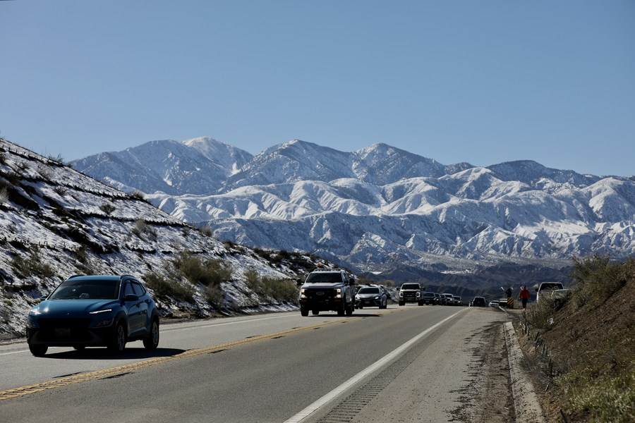 Vehicles are seen along a road with the snow-covered mountains as the background in Southern California's San Bernardino County, the United States, March 2, 2023. (Xinhua)