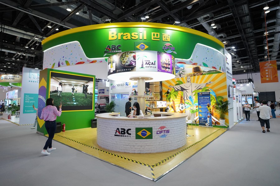 Visitors tour the Brazil exhibition booth during the 2021 China International Fair for Trade in Services (CIFTIS) in Beijing, capital of China, Sept. 5, 2021. (Xinhua/Wang Tiancong)