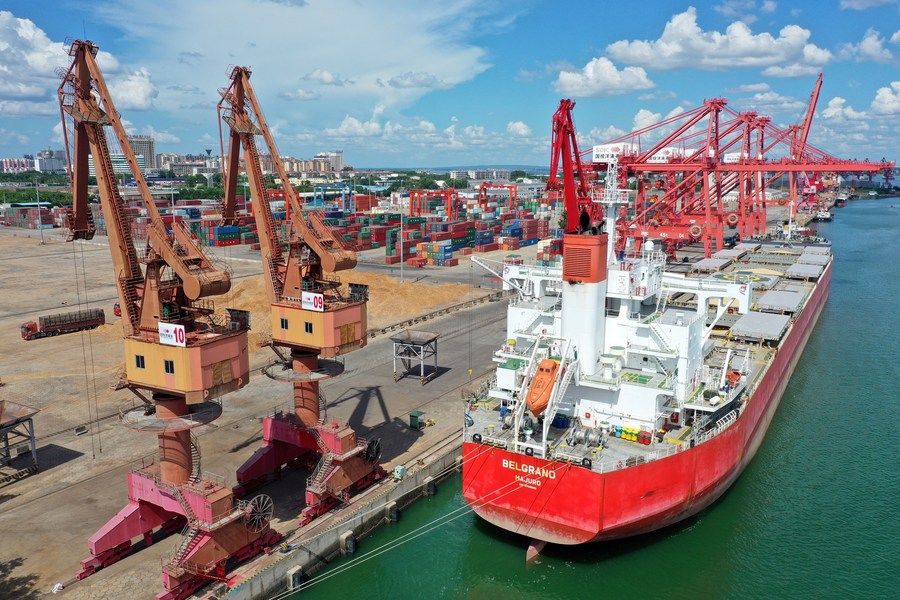 A cargo ship loaded with soya beans from Brazil prepares to unload at Yangpu port in the Yangpu Economic Development Zone in Danzhou, south China's Hainan Province, July 22, 2022. (Xinhua/Guo Cheng)