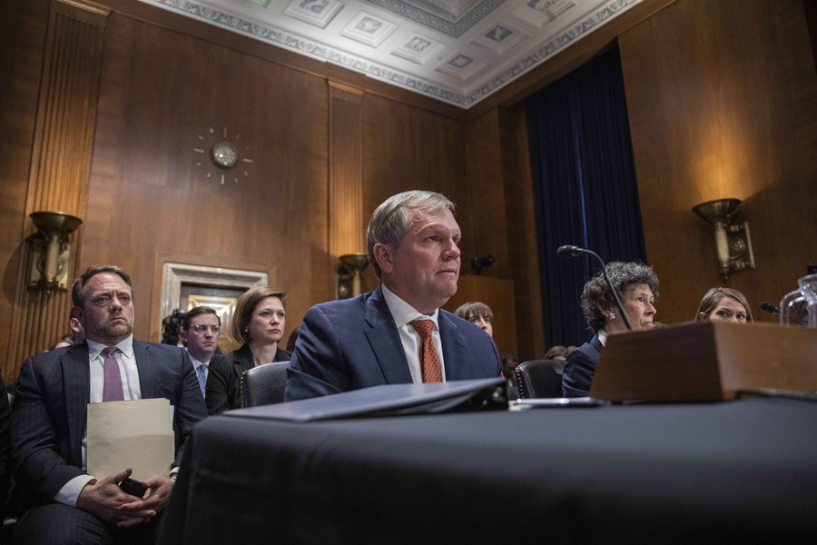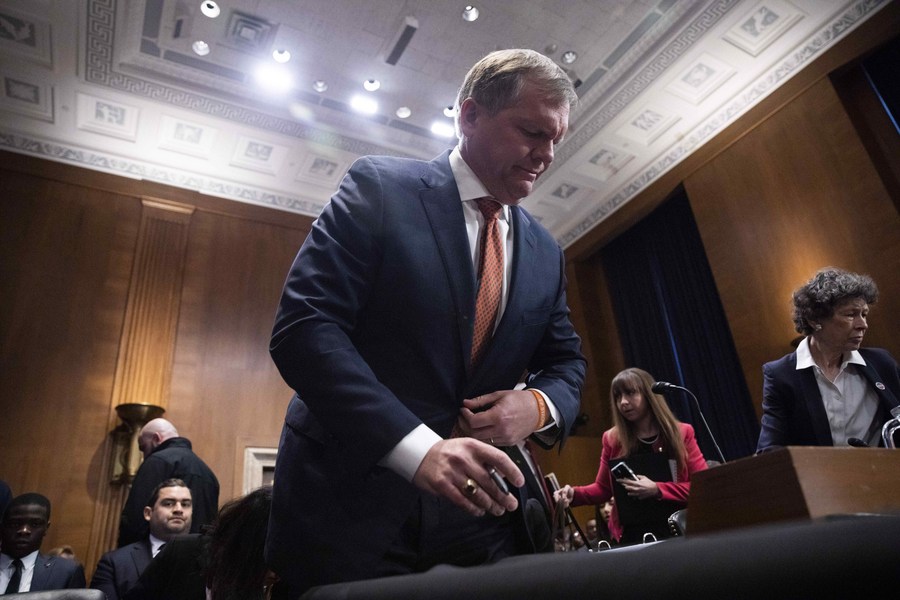 Norfolk Southern CEO Alan Shaw (Front) prepares to testify at a hearing before the Senate Environment and Public Works Committee on protecting public health and the environment in the wake of the Norfolk Southern train derailment and chemical release in East Palestine, Ohio, in Washington, D.C., the United States, March 9, 2023. (Photo by Aaron Schwartz/Xinhua)