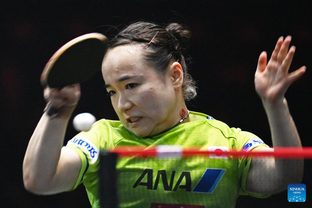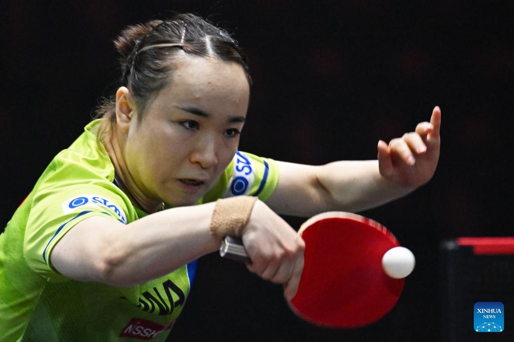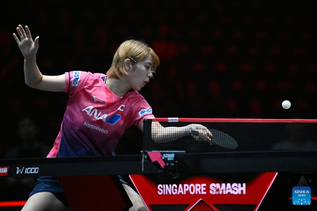 Nagasaki Miyu of Japan hits a return during the women's singles round of 64 match against Chen Meng of China at World Table Tennis (WTT) Singapore Smash in Singapore on March 11, 2023. (Photo by Then Chih Wey/Xinhua)