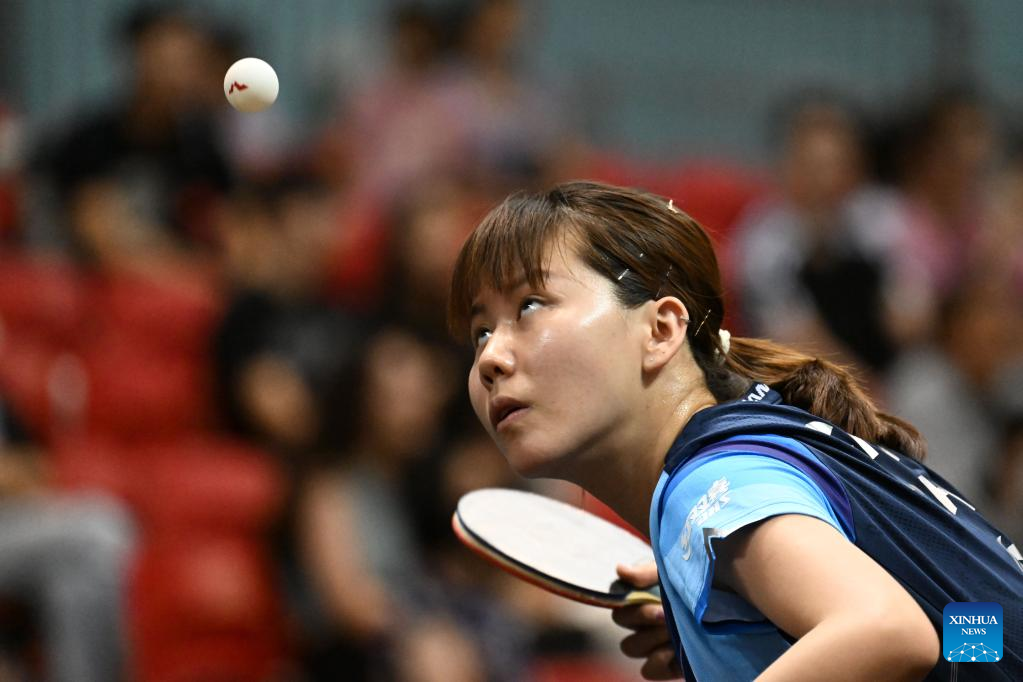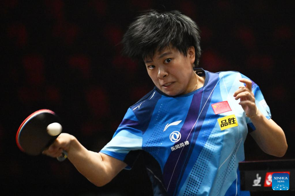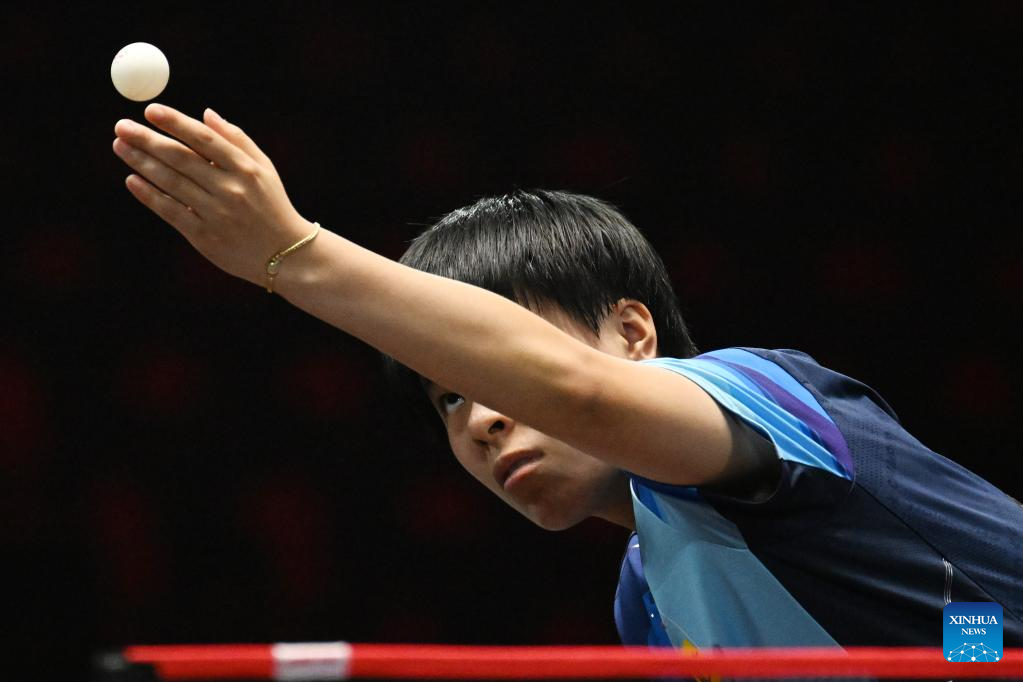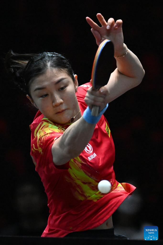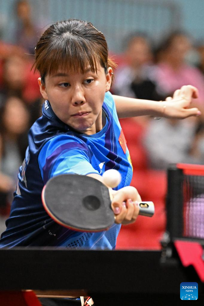 Wang Yidi of China competes during the women's singles round of 64 match against Bernadette Szocs of Romania at the World Table Tennis (WTT) Singapore Smash in Singapore on March 11, 2023. (Photo by Then Chih Wey/Xinhua)