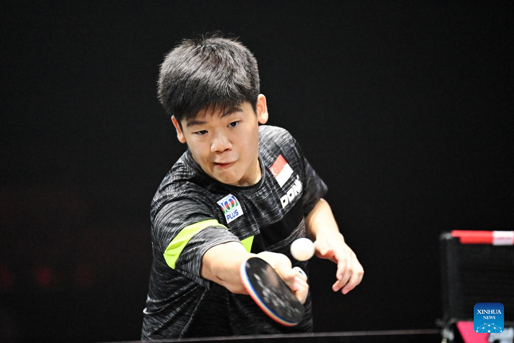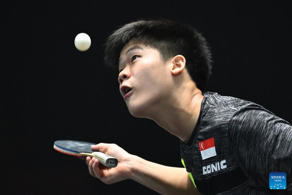 Quek Izaac of Singapore hits a return during the men's singles round of 64 match against Sharath Kamal Achanta of India at the World Table Tennis (WTT) Singapore Smash in Singapore on March 11, 2023. (Photo by Then Chih Wey/Xinhua)