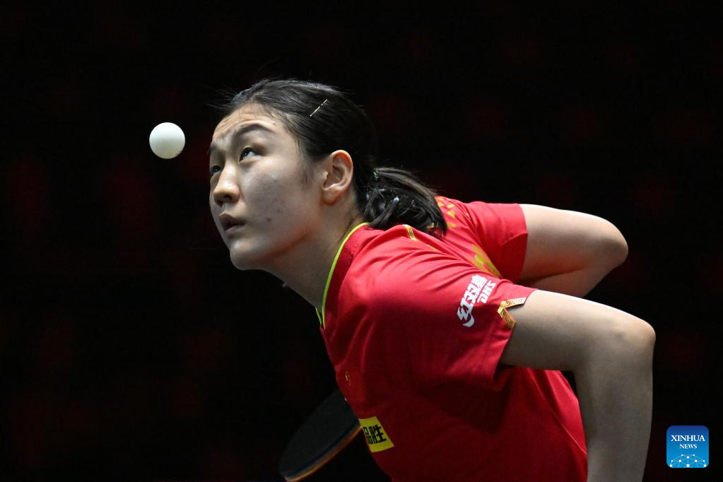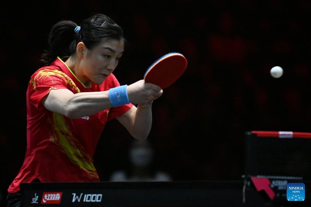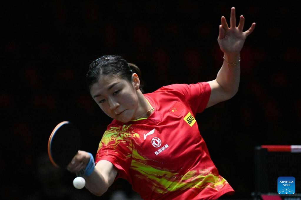 Chen Meng of China hits a return during the women's singles round of 64 match against Nagasaki Miyu of Japan at World Table Tennis (WTT) Singapore Smash in Singapore on March 11, 2023. (Photo by Then Chih Wey/Xinhua)