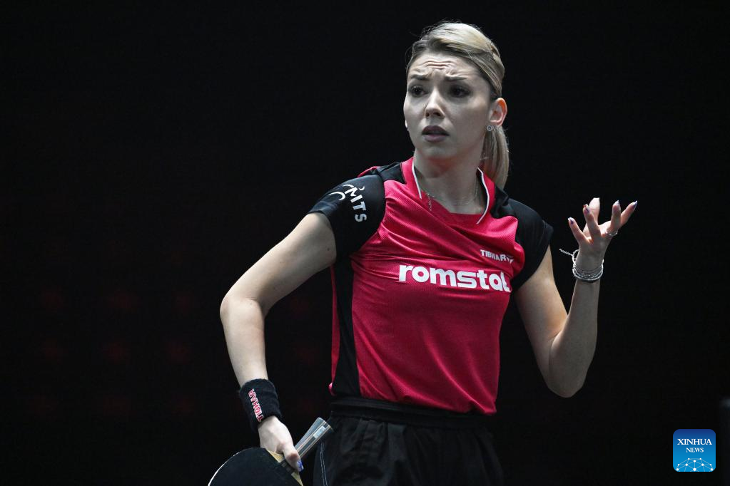 Bernadette Szocs of Romania reacts during the women's singles round of 64 match against Wang Yidi of China at the World Table Tennis (WTT) Singapore Smash in Singapore on March 11, 2023. (Photo by Then Chih Wey/Xinhua)