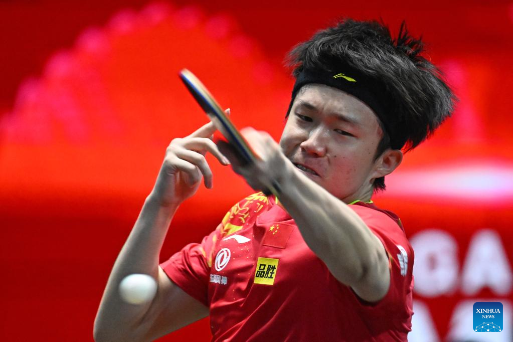 Wang Chuqin of China hits a return during the men's singles round of 64 match against Wang Yang of Slovakia at the World Table Tennis (WTT) Singapore Smash in Singapore on March 11, 2023. (Photo by Then Chih Wey/Xinhua)