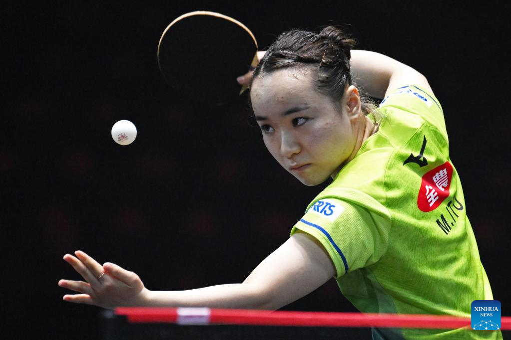 Ito Mima of Japan hits a return during the women's singles round of 64 match against Lily Zhang of the United States at the World Table Tennis (WTT) Singapore Smash in Singapore on March 11, 2023. (Photo by Then Chih Wey/Xinhua)