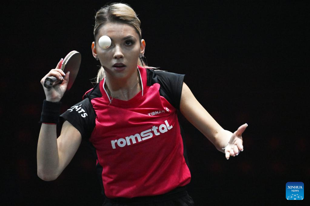 Bernadette Szocs of Romania serves during the women's singles round of 64 match against Wang Yidi of China at the World Table Tennis (WTT) Singapore Smash in Singapore on March 11, 2023. (Photo by Then Chih Wey/Xinhua)