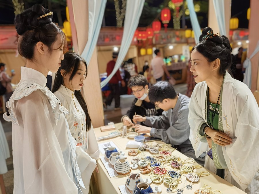 A stall owner introduces products to tourists at an ancient-style market during the Dongpo cultural singing competition in Haikou, capital of south China's Hainan Province, on Feb. 19, 2023. (Xinhua/Zhou Huimin)
