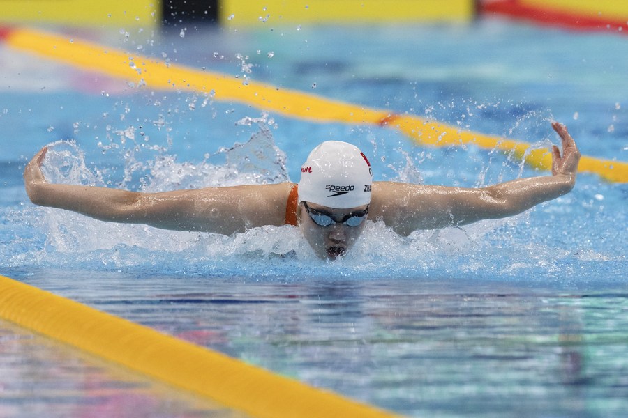 Zhang Yufei of China competes during the women's 100m butterfly heat at the 19th FINA World Championships in Budapest, Hungary on June 18, 2022. (Photo by Attila Volgyi/Xinhua)