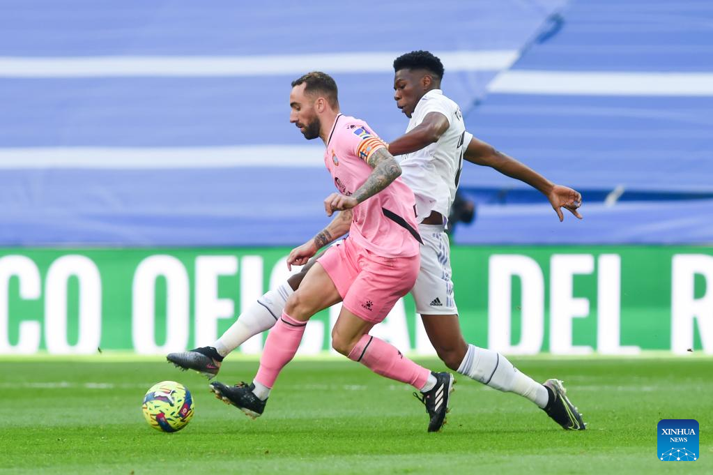 Real Madrid's Vinicius Jr. (R) vies with Espanyol's Oscar Gil during a La Liga Santander match between Real Madrid and RCD Espanyol in Santiago Bernabeu Stadium, Madrid, Spain, on March 11, 2023. (Photo by Gustavo Valiente/Xinhua)