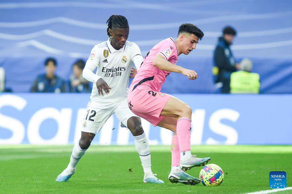 Real Madrid's Eduardo Camavinga (L) vies with Espanyol's Ruben Sanchez during a La Liga Santander match between Real Madrid and RCD Espanyol in Santiago Bernabeu Stadium, Madrid, Spain, on March 11, 2023. (Photo by Gustavo Valiente/Xinhua)