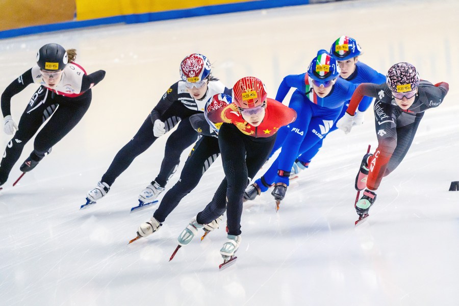 Zang Yize (front) of China in action during the women's 1,500m Final B at the ISU World Short Track Speed Skating Championships in Seoul, South Korea, March 11, 2023. (Photo by James Lee/Xinhua)