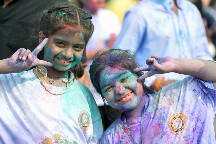 Children smeared with colored powder take part in a celebration of the Holi festival in Katunayake, Sri Lanka, March 12, 2023. (Photo by Ajith Perera/Xinhua)