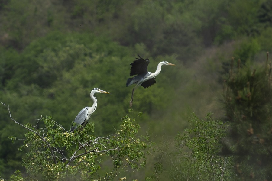 Herons are pictured at "Lu Ling," which in Chinese refers to the mountain that herons inhabit, in Linghai of Jinzhou City, northeast China's Liaoning Province, May 4, 2022. (Xinhua)