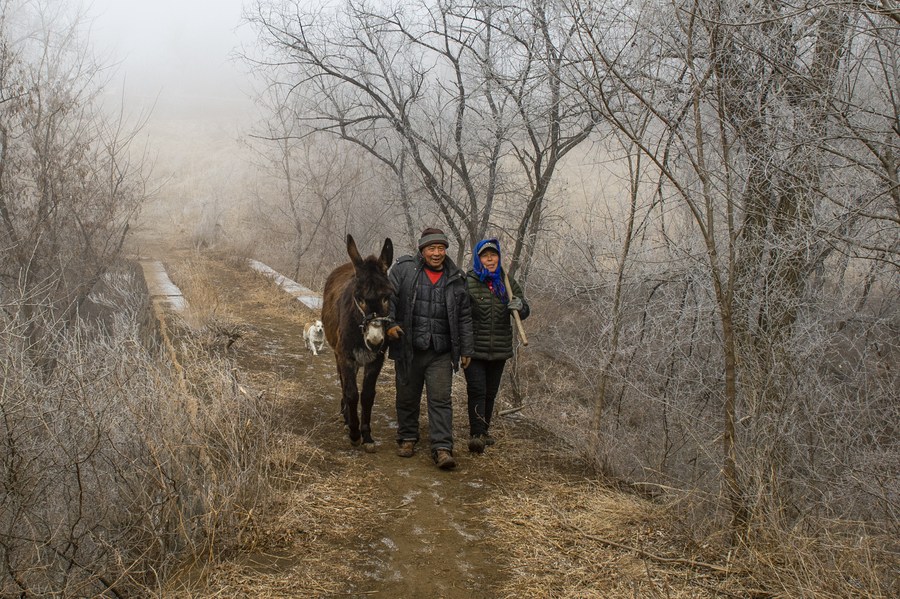 Tian Wangui (L) and his wife Lu Min (R) patrol over "Lu Ling," which in Chinese refers to the mountain that herons inhabit, in Linghai of Jinzhou City, northeast China's Liaoning Province, Feb. 10, 2023. (Xinhua)