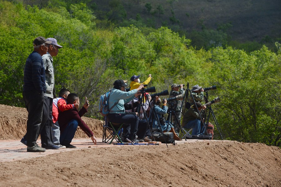 People view and take pictures of egrets and herons at "Lu Ling," which in Chinese refers to the mountain that herons inhabit, in Linghai of Jinzhou City, northeast China's Liaoning Province, April 30, 2022. (Xinhua)