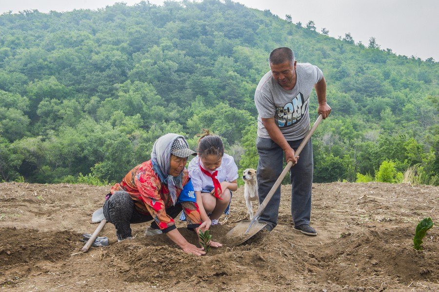 Tian Wangui (R) and his wife Lu Min (L) help a girl plant a tree at "Lu Ling," which in Chinese refers to the mountain that herons inhabit, in Linghai of Jinzhou City, northeast China's Liaoning Province, June 3, 2022. (Xinhua)