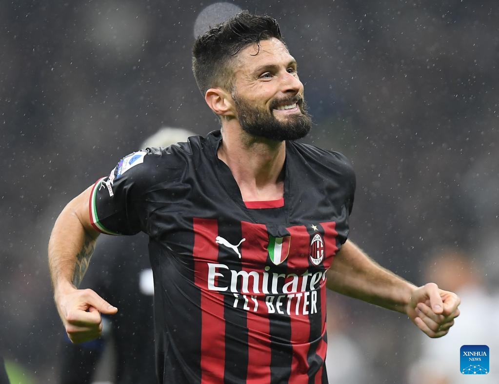 AC Milan's Olivier Giroud celebrates his goal during a Serie A football match between AC Milan and Salernitana in Milan, Italy, on March 13, 2023. (Str/Xinhua)
