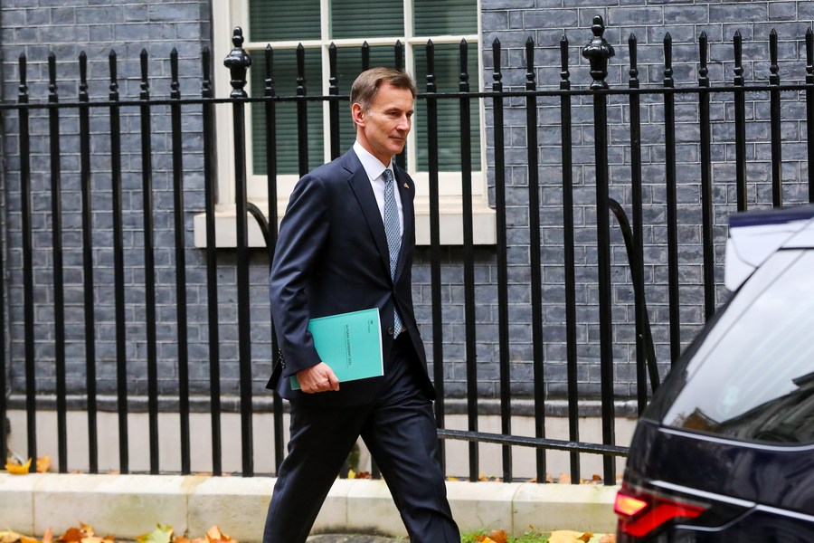 Chancellor of the Exchequer Jeremy Hunt of the United Kingdom (UK) leaves 11 Downing Street in London, Britain, on Nov. 17, 2022. (Xinhua)
