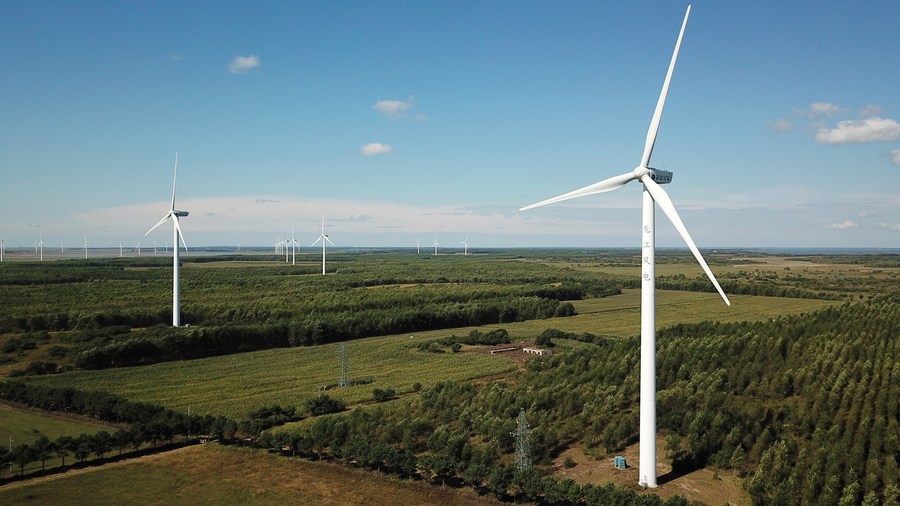 Aerial photo taken on Sept. 8, 2021 shows a wind farm of the Daqing wind power project in Daqing, northeast China's Heilongjiang Province. (Xinhua/Wang Jianwei)