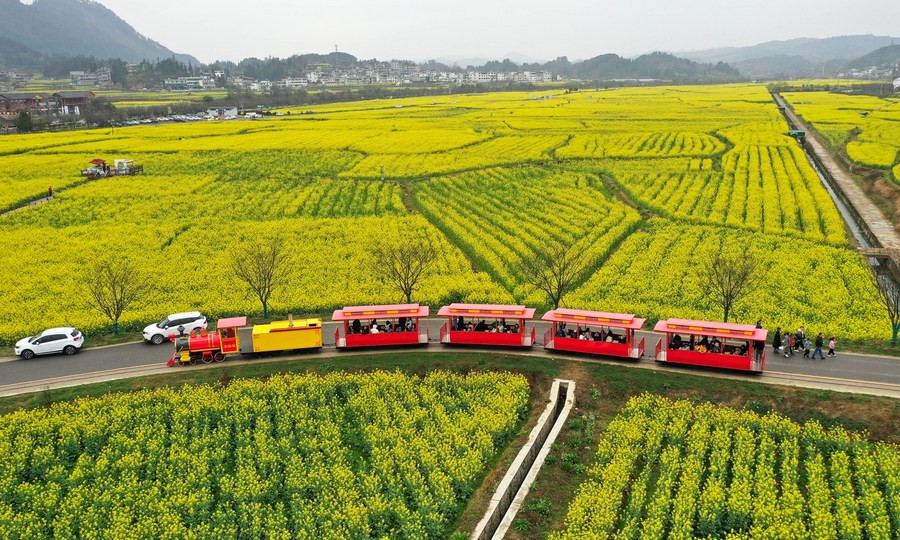 This aerial photo taken on March 12, 2023 shows visitors take sightseeing mini trains to enjoy cole flowers in Panjiang Township of Guiding County, southwest China's Guizhou Province. (Xinhua/Yang Wenbin)